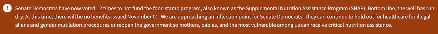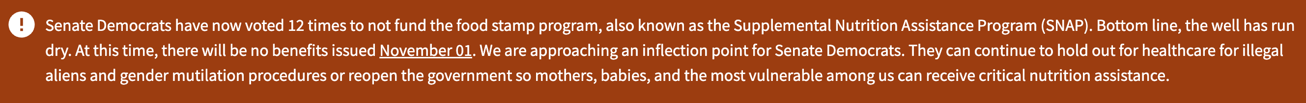 Senate Democrats have now voted 12 times not to fund the food stamp program, also known as the Supplemental Nutrition Assistance Program (SNAP). Bottom line, the well has run dry. At this time, there will be no benefits issue November 01. We are approaching an inflection point for the Senate Democrats. They can continue to holdout for healthcare for illegal immigrants and gender mutilation procedures or reopen the government so mothers, babies, and the most vulnerable among us can receive critical nutrition assistance. )